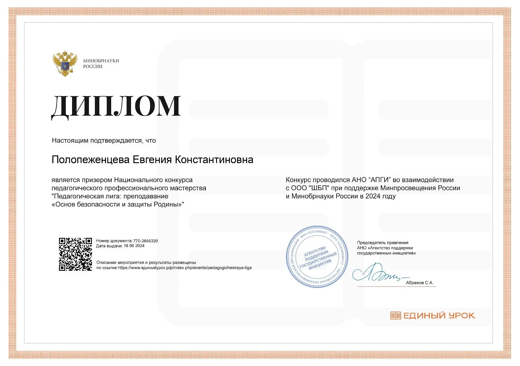 Полопеженцева Евгения Константиновна, педагог-организатор. Призёр Национального конкурса педагогического профессионального мастерства «Педагогическая лига: преподавание «Основы безопасности и защиты Родины». |